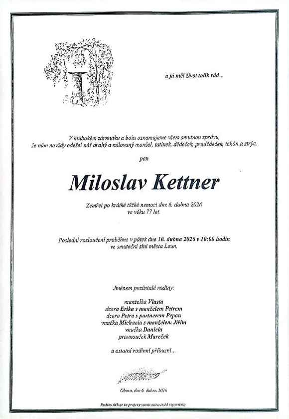 S velkou lítostí Vám oznamujeme, že v pondělí 6. dubna 2026 zemřel po krátké těžké nemoci ve věku krásných 77 let Zasloužilý hasič Miloslav Kettner.